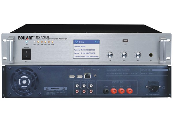性能卓越的CD音质输出,100V、70V、4-16 OHM输出可选,输出功率350W; 短路、过热、过载自动检测保护功能,指示灯示警,蜂鸣器告警; 3.5寸TFT彩色屏显示,画面友好; 操作简便,无须人工设置,联网后自动完成与服务器联机; 配置遥控器操作全部功能:空闲/实时采播/定时打铃/定时节目/自由点播,以及快进/快倒/暂停/[A-B]/音量键操作,音量[+][-]调节; 通过RJ45接入局域网,速度100Mbps; 支持有线网络和WIFI无线网络两种接入方式; 支持从服务器、从本地内存和从U盘三种方式获取曲目; 自动完成定时节目同服务器的同步,服务器节目发生变更,联网自动同步; 联网和离线两种工作模式,在发生网络故障时仍然可以执行定时任务; 支持远程定点播音、远程分组播音和全区播音; 持跨VLAN或三层路由使用。 |