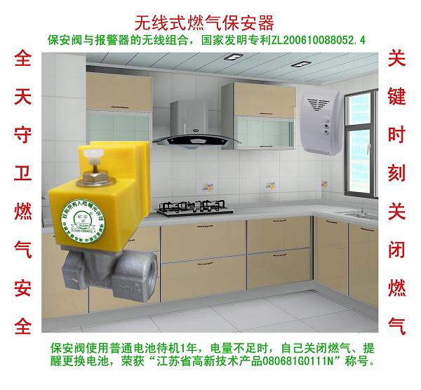 无线智能型燃气保安阀与报警器无线组合,全天守护全家安全,关键时刻关闭燃气;保安阀采用3节7号电池做电源,没有外接电线,待机使用一年以上,电量不足时自己关闭燃气、提醒更换电池。