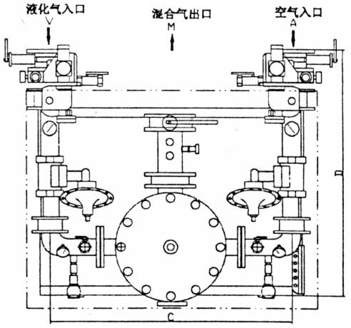 Regulating the liquefied gas and compress air at the same pressure through the regulator connections, the High-pressure Ratio Control Mixer change the proportion of the gas mixture while the two sources of the gas of the same pressure go through different size of the cross section. And the flow is automatically subjected to the change of the pressure output by the compound air. In the range of 1.5 times of the utmost explosion limit, the proportion of the gas mixture in the High-pressure Ratio Control Mixer can also be adjusted to in succession. Those safe chains are inclusive of the mixer: