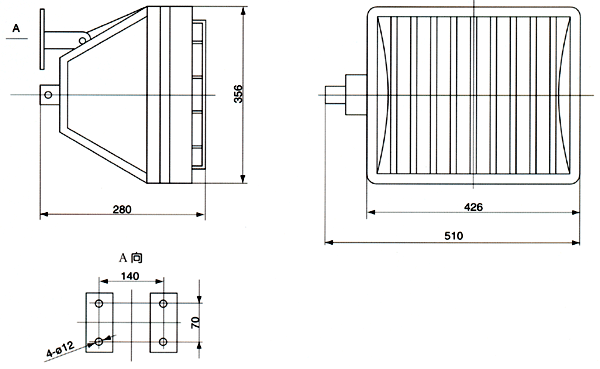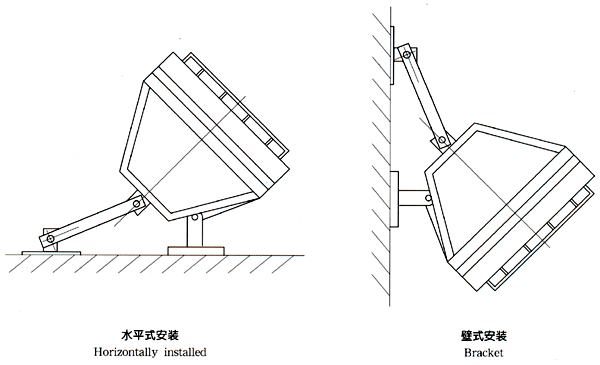 ● 灯体可在水平安装或壁式安装,仰角在45°~90°内可调