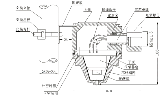 输出信号: 420mA标准电流信号输出及第一段报警无源触点输出,