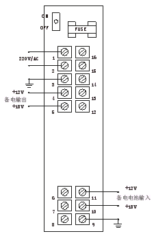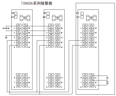 注意:以上电路边线方法需在定货时,用户提出要接备用电源的前提下,由厂家提供可 接备用电源的TONS-90A系列报警器,再按上图连接。