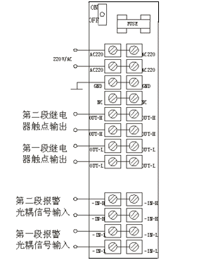 输入信号:配接TON90A系列报警器的二段报警光电耦合输出。 输出信号:分别对应二段报警光耦信号,输出二组继电器触点信号(常开 或常闭)。 触点容量:输出继电器触点容量为22OV/10A。 电 源:220V/50Hz。