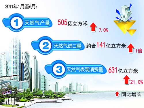 进口量持续增加。1至6月进口天然气约合141亿立方米(其中中亚天然气69亿立方米,LNG 72亿立方米),同比增长1倍。进口资源占国内消费总量的比重达到22.4%,同比增加9个百分点。表观消费大幅增长。1至6月天然气表观消费量631亿立方米,同比增长21.0%。前4个月,随着天气逐步变暖,日均用气量由高峰逐月回落,但同比仍然保持较高增速;5月后,发电用气较快增长。天然气产量的迅速增长,为居民用气 、发电等行业提供充足的能源。